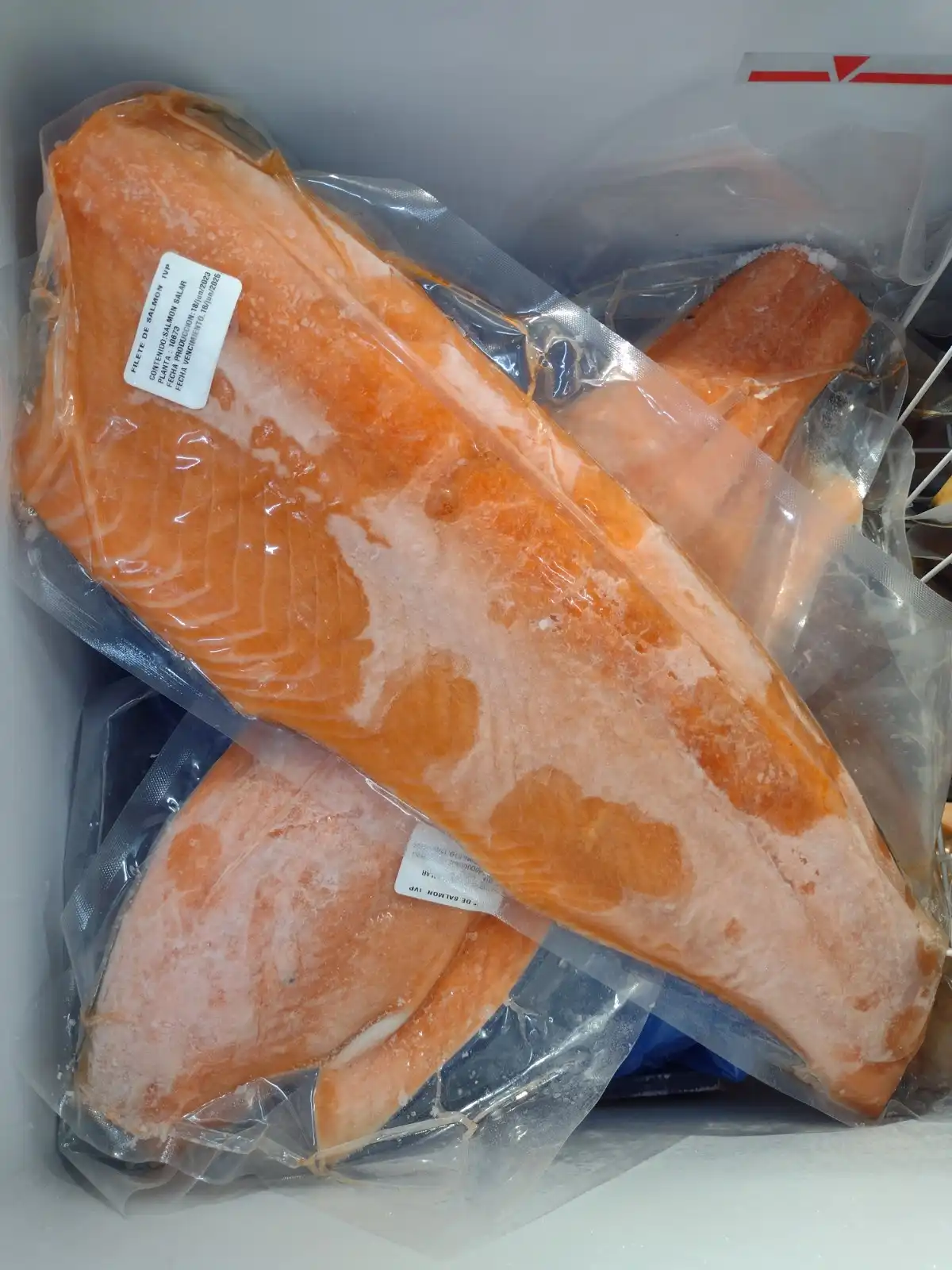 Filete de salmón atlántico calibre 2-3 libras, sin espinas, con piel, sellado al vacío.
